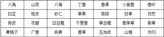 ②將八角、桂皮、陳皮、丁香、山奈、花椒、茴香、香葉、草果,良姜、甘草、紅辣椒干一起裝入香料袋內(nèi),袋口扎牢。