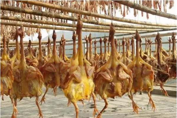 將腌好的雞取出,用竹簽撐開雞胸,鉤住雞嘴,掛在自然通風(fēng)處的竹竿上晾約半個(gè)月,直到雞肉中的水分吹干,即成半成品。