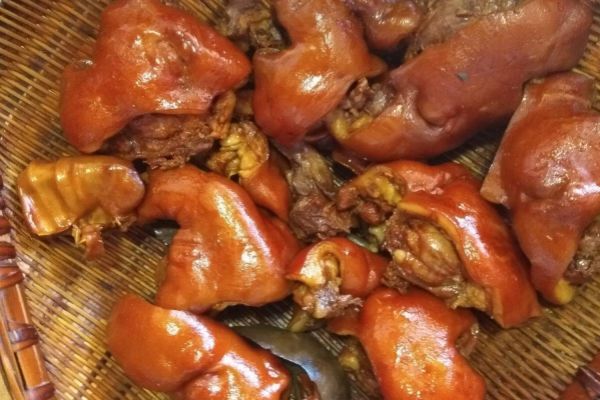 3、炒制:加入蔥姜蒜、少許白糖炒糖色,微微上色后烹入適量花雕酒,下入提前洗凈、處理好的豬蹄,加入清水加蓋鹵制45分鐘即可。