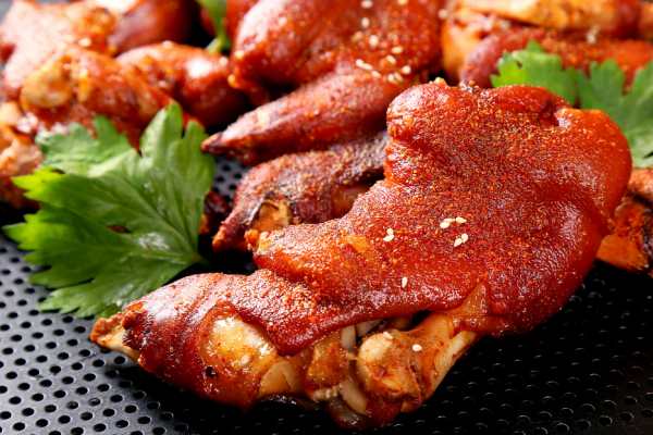 豬蹄本身肉多油膩,經(jīng)過(guò)鹵、烤后,內(nèi)部入味,油脂被烤出一部分,成菜就不膩了。燒烤店可信手拈來(lái),烤制過(guò)程中可以取出豬蹄刷上調(diào)料或者撒上點(diǎn)辣椒粉等,這樣可以豐富豬蹄的口感。
