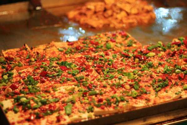 鐵板上抹上料油,然后擺放豆腐,然后豆腐正反面均勻的撒上秘制醬料,和少許鹽,最后撒上少量花椒粉,撒上料油然后開火,中小火然后小火,把豆腐煎硬一點 ,最后撒上蔥花 ,制作完成,單獨準備最辣的辣椒粉 ,顧客要加辣可以撒