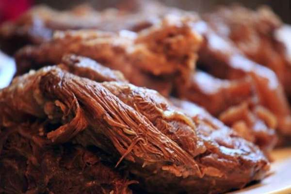 ③將烤熟的牛肉放入鹵汁中,用旺火燒開,改小小火煮2小時,然后撈出晾涼,刷上芝麻油20克即為成品;食用時手撕,切片均可。