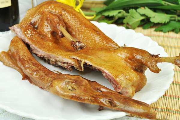 ③將鴨子放置在案板上,背部朝下,頭朝里,用厚木板使勁壓斷胸骨、肋骨使鴨子呈扁長形形態。