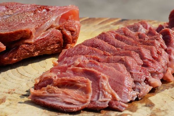 (1)原料選擇及整理 選用符合衛(wèi)生標(biāo)準(zhǔn)的牛的腿肉、脊肉。先將牛肉切成重0.4~0.8公斤重的大塊,用清水漂洗后放入鍋中,每50公斤鮮牛肉加水25公斤,老姜0.3公斤,硝酸鈉25克煮開,過紅即行撈起(肉塊切開后,切面呈現(xiàn)粉紅色),目的是除去血腥。