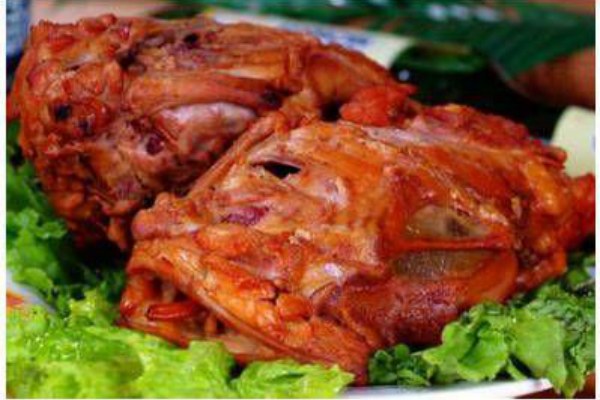 3.醬制:腌好的肉坯瀝干鹵水。 鍋內先燒開水,再投入香料、輔料,然后將肉坯下鍋,旺火煮制,加入紹酒、醬油后,再改小火燜 2 小時,待皮色呈麥稈黃色時,在出鍋前 30 分鐘加入糖。 出鍋時逐塊擺在盤里,皮朝上,趁熱將肋骨拔出,保持形狀美觀,冷卻后即為成品。