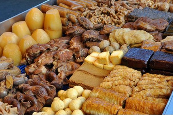 做法:將川椒100克、八角150克、桂皮100克、丁香50克、紅曲米50克、甘草50克、裝入“藥袋”;肥肉500克切片,炸出豬油后棄渣。取大不銹鋼鍋,倒入清水12.5千克,老抽1500克,生抽1500克,魚露500克,冰糖150克,精鹽500克,用旺火燒開后,放入豬油,南姜250克,青蒜250克,炸蒜頭150克,芫荽250克,紹酒250克,“藥袋”煮開20分鐘,便成鹵水。鹵水存放時間愈長愈香。