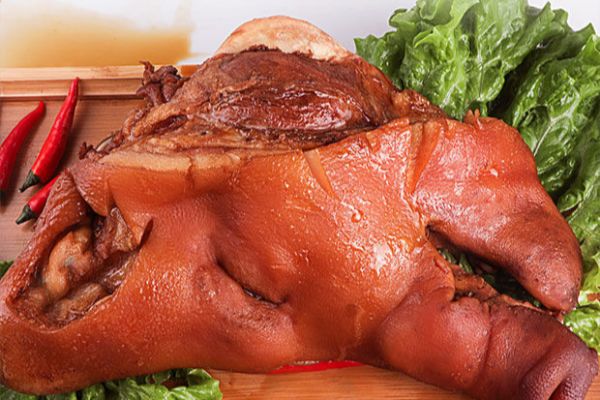 將洗凈的豬頭肉、口條、耳朵放入開水鍋中焯水 15 分鐘,撈出,瀝干,放入老鹵湯鍋內,加上其他調味料和香辛料,加水漫過豬頭,大火燒開文火煨 2 小左右,撈出,出鍋的豬頭,趁熱拆出骨頭,整形后即為成品。