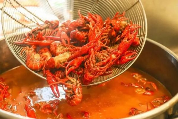 香料、干辣椒等放好之后,接下來就是將精鹽、炒制好的糖色放入鹵鍋中,以小火慢熬,保持鹵汁沸而不騰的狀態(tài),時間約為4小時左右,然后將處理好的龍蝦(這里小龍蝦每鍋鹵制控制在3千克左右即可,以保證小龍蝦成品的口感,如果撈出后不能馬上銷售出去,可將其放入鹵油中浸泡,到銷售時再撈出。)放進去鹵制,熟透后撈出,瀝干凈油,裝盤即可。
