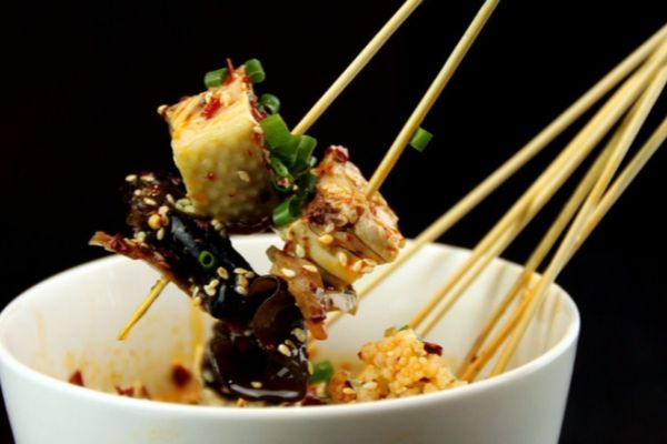 4、將燙熟的葷素串串放入事先調好的底湯中即可。