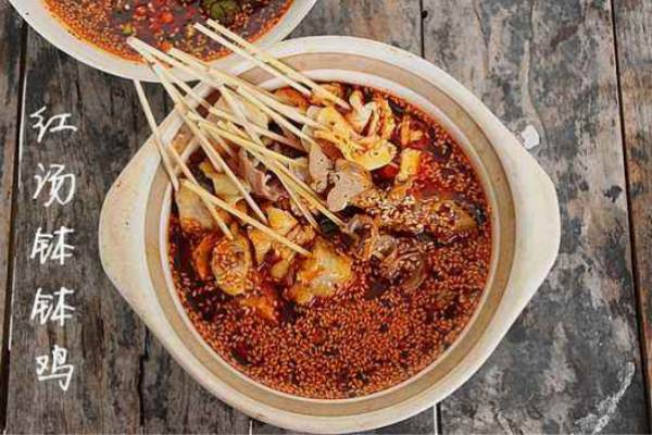 制作紅湯麻辣缽缽雞,一般選用純菜籽油,香料宜少,香料太重易蓋菜品的鮮香味,高湯一定要先用大火熬制再調(diào)中小火,這樣的結(jié)果能讓湯汁更加濃郁。泡制的菜品賣完之后要另外浸泡菜品時還要補充一些味道或調(diào)好的紅湯汁,不然湯汁味道就會偏淡,致菜品香味不足。