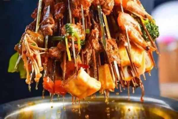 用一大的不銹鋼桶,放入高湯50斤,上面做好的底料8斤,用大火燒沸10分鐘后,調(diào)入味精200克,雞精300克,胡椒粉100克,極品籽粉100克,雞肉香精膏50克,火鍋飄香王20克。將湯調(diào)至咸鮮味美,就可把客人需要的串串,放入里面燙至菜熟,取出,放入一個(gè)調(diào)好料的冷鍋里面。