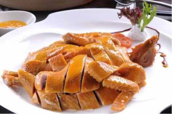 將雞吊提多次的目的,是有利于雞身內(nèi)外受熱均勻和利于雞肉快速成熟??图蚁滔汶u的佐料為姜蔥茸,即咸香雞斬塊裝盤(pán)后,蘸姜蔥茸味碟而食。