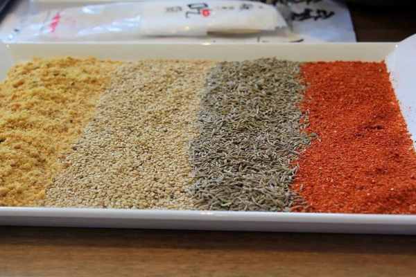 花椒粉100g,孜然粉100g,芝麻粉100g辣椒粉100g,花生粉100g,五香粉30g,aaa香料1g,鹽100g,白砂糖10g,味精50g,將這幾種調料混合在一起幾攪拌均勻即可。