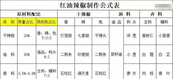秘制配方要點:制作紅油辣椒時,要注意辣椒品種的搭配、香料的使用寧少勿多,甚至可以不放,油溫把握好、三溫三炸不可少。附紅油辣椒基礎配比公式表: